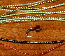 ヘアーライン社のミッジ・ダイヤモンド・ブレイド(全20色)は、パール・ダイヤモンド・ブレイド(全22色)の極細バージョンです。ミッジ・ダイヤモンド・ブレイドは、パール素材が折り込まれた丈夫なヤーン状のボディ用マテリアルです。フックシャンクに巻き付けるだけで簡単に綺麗なボディが製作できます。小型のストリーマーやウエット、ニンフのボディやウイングケース(左の画像)などにご使用いただけます。カラーも豊富に揃っているため様々なフライパターンに使われています。カラーは下記の全20色です。ご注文の際には、カラーをお選び下さい。